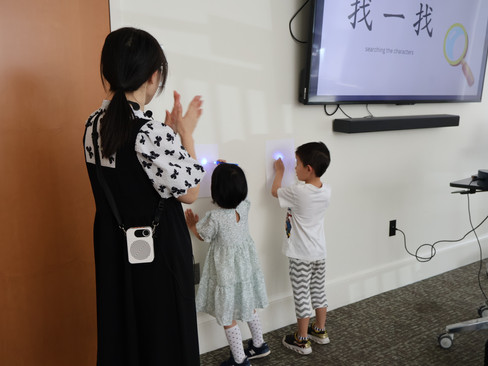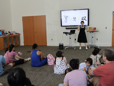 The storytime began with welcome songs and ukulele-led interaction, followed by movement activities that encouraged children to respond physically and verbally in Chinese. A key part of the program was the introduction of the Chinese characters 手 (“hand”) and 双 (“pair”), helping children build vocabulary through visual recognition, repetition, and action-based learning.